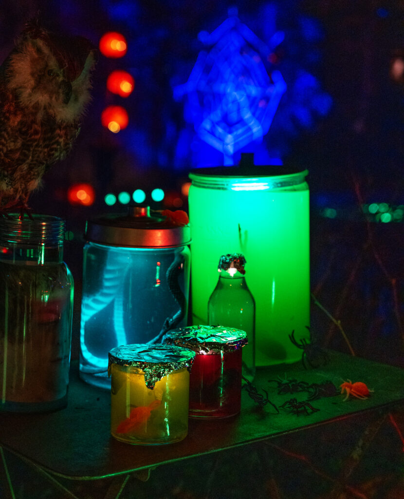 Pelottava musiikki soi, eri väriset valot vilkkuvat, pääkalloja lojuu siellä täällä, noidat hiipivät pihamaalla ja kurpitsalyhtyjen silmät hohtavat. Purkeissa on sormia ja skorpioneja, hämähäkin seittiä on viritelty sinne tänne. Yleisön joukosta kuuluu lapsen huudahdus: