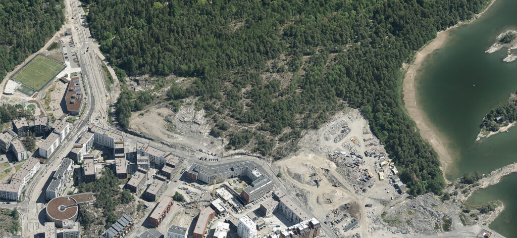 Kadut rakennetaan alueelle, joka näkyy kuvan keskivaiheilla. Kuvaan on yhdistetty kaksi ilmakuvaa, jotka on otettu vuonna 2023. Kuva: Helsingin kaupunki