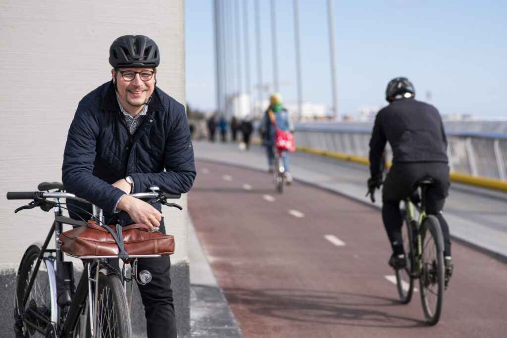 Musta maantiekiituri etenee siltaa pitkin yhtä kevyesti ja vaivattomasti kuin horisontissa näkyvät alukset aaltojen seassa. Kypärän alla välkkyy hymy, joka ei jätä mitään epäselväksi. Pyöräily vei miehen mennessään jo kauan aikaa sitten.