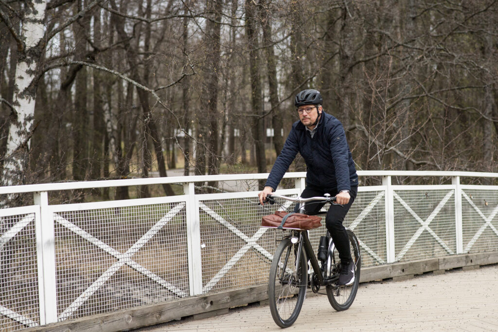 Tuuli ujeltaa korvissa. Edessä on hiljattain avattu Kruunuvuorensilta, ja yläpuolella lentelee lokkeja. Vuosaaren Aurinkolahdessa asuva Mika Tiainen, 47, on matkalla töistä kotiin. Ei kävellen, vaan sähköpyörän päällä – ensimmäistä kertaa koskaan.